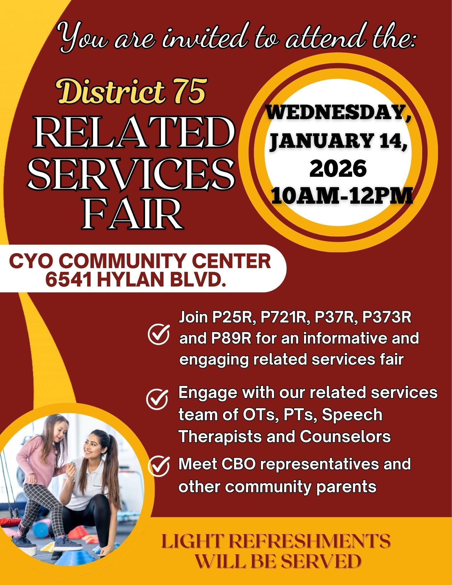 District 75 Related Services Fair - January 14th @ 10AM - CYO COMMUNITY CENTER 6541 HYLAN BLVD.